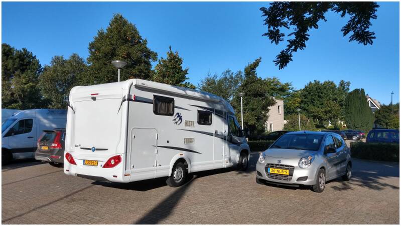 In Dalfsen, op de Parking Staitionsweg is nog precies 1 camperplek over: voor ons dus! Buscamper eigenaren tegenover ons komen meteen vragen of ze even mogen proberen of onze hoge tuinstoelen in hun camper passen. Dat lukt....gelukkig krijgen we ze wel weer terug 😜.