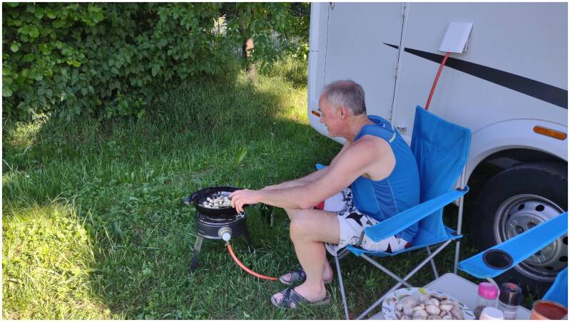 Na het wakker worden lekker buiten gegeten. We wilden nog lozen, maar bouwvakkersbusjes stonden op de loosplek, helaas. Alleen de wc leegmaken was geen probleem.