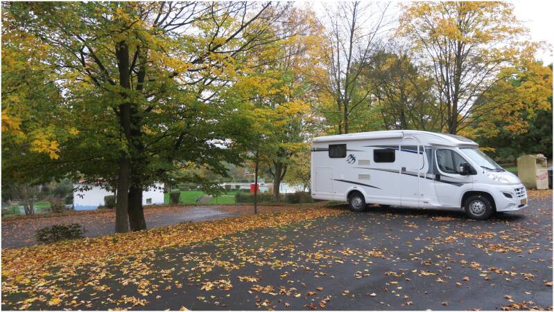 Een half uur omrijden wordt het, maar tegen half zes rijden we de camperplaats "Freibad" in Reinhardshagen op. Inmiddels waait en regent het weer. Wijs geworden zetten we de camper maar niet onder de eikenbomen, maar aan de overkant waar de blaadjes al van de bomen af zijn.
