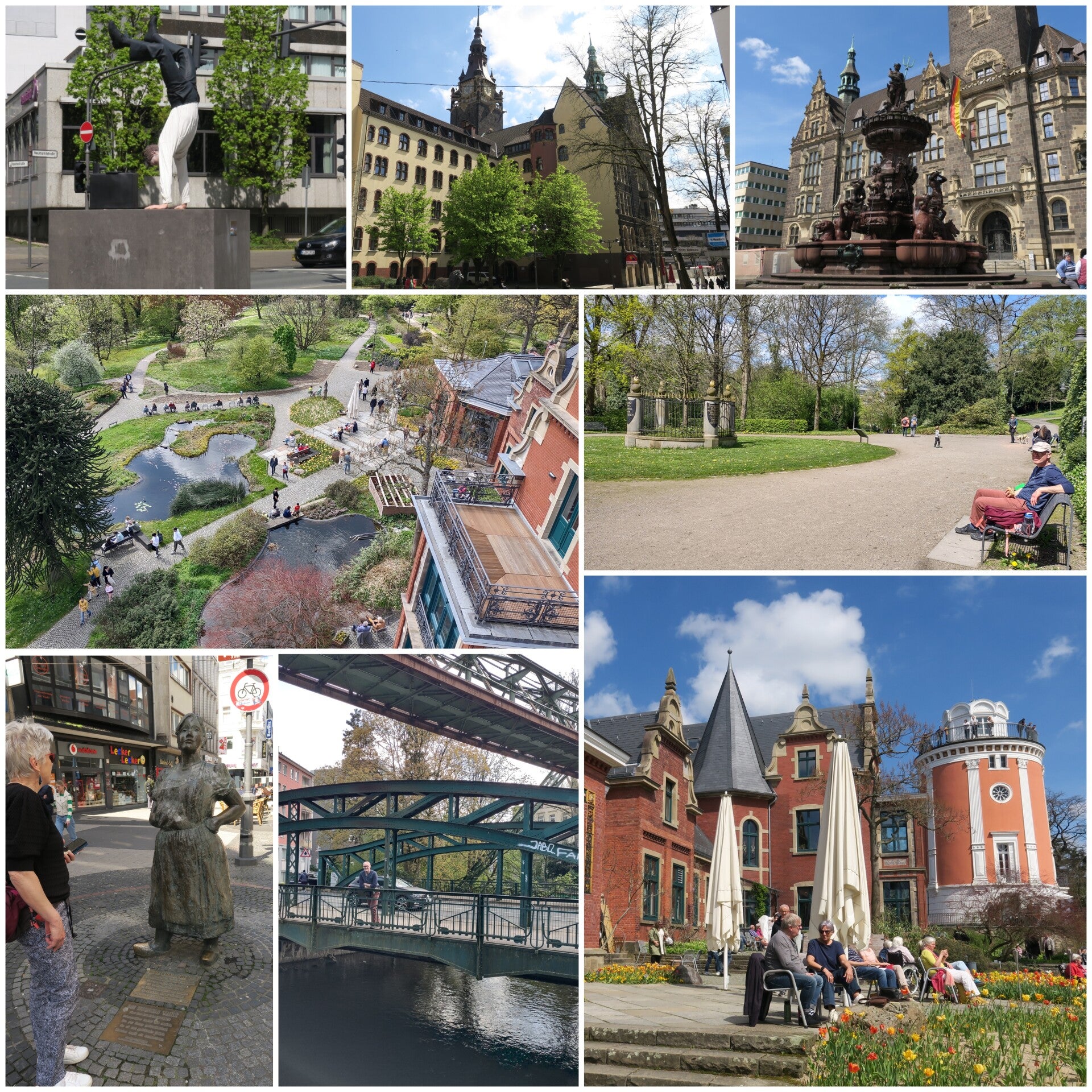 We worden gewekt door een stralende zon (en door getrap tegen een voetbal). Heerlijk na die toch wel koudere en zon arme dagen. Wuppertal is zoals al eerder gezegd beroemd vanwege de "Schwebebahn" ( uit 1901). Die hebben we al gezien, maar vandaag gaan we er ook gebruik van maken om naar het beginpunt van de stadswandeling Wuppertal te gaan. Het kopen van een dagkaartje lukt hier niet met de pin en geld hebben we niet direct voor handen. Eerst nog even cash pinnen dus en dan kunnen we instappen. De Bahn volgt grotendeels de Wupper, zweeft er letterlijk boven, en dit levert mooie plaatjes op. Een beetje wennen aan het heen en weer slingeren in de bochten, maar verder gaat de rit soepel. Na het uitstappen nog even wat foto's van de Schwebebahn (blijft toch een mooi gezicht) en dan maar eens zien wat de stad te bieden heeft. Na een paar straten komen we bij de eerste kerk van vandaag, we kunnen er helaas niet in. Iets verder lopen we een lange trap omhoog het Luisenpark in. Een mooi park waar we gauw even een broodje eten. Een stuk verderop hebben we een mooi uitzicht over de stad en over de RK St Laurentiuskerk. In en buiten deze kerk zien we veel communicantjes en trotse ouders, het lijkt wel een bruiloft zoveel witte jurkjes we zien.