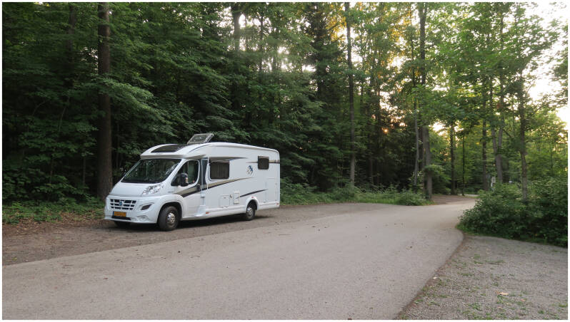 We rijden naar de camperplaats Sportplatz, ook in Pforzheim en treffen een wat verwaarloosde parkeerplek in de zon en met dreunmuziek vanuit in de buurt geparkeerde auto's. Eerst maar eens eten en dan verder kijken. Nee, zelfs eten gaan we niet doen: te warm en teveel herrie. Een P&R een klein stukje verderop zit vol mieren, dus na het eten rijden we weer terug naar het Wildpark, dezelfde overnachtingsplek als gisteren.