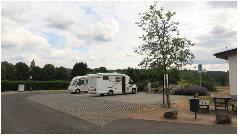 Op naar Neukirchen, maar eenmaal daar aangekomen valt het allemaal tegen. Het museum is nog maar kort open en we besluiten dan maar door te rijden. De camperplaats voor vanavond ligt in Battenberg maar we zijn nog niet lang onderweg of we moeten al weer omdraaien. Er is een ongeluk gebeurd en de hele weg is versperd, brandweer en politie komen net aan. Dat wordt dus omrijden. Het volgende uur begint het te regenen, een primeur voor overdag. We eten in Willersdorf en ook voor het eerst deze vakantie hebben we geen van beide internetontvangst. Gelukkig hebben we dat niet nodig voor onze maaltijd 😄. Het laatste stukje rijden we naar de cp An der Festhalle. Wat een prachtplek is dit. Hoog boven het stadje en wat een uitzicht en wat een rust!