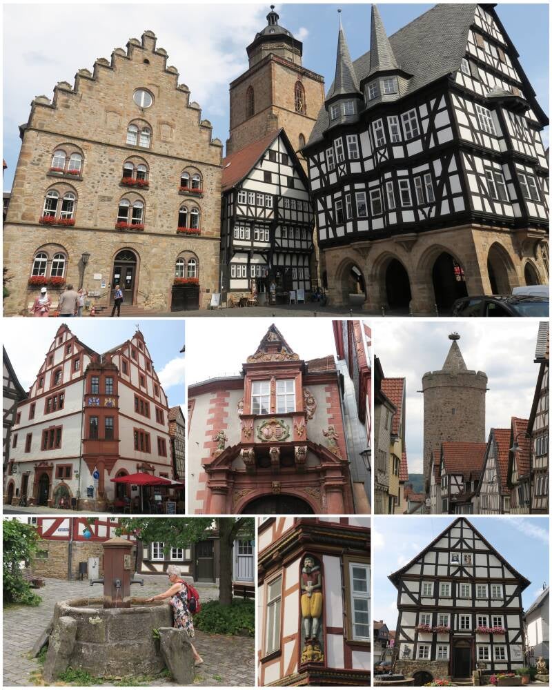 Vandaag de laatste dag van de "Märchenstraße". Twee plekken nog om te bezoeken. Allereerst Alsfeld. Het valt ons op dat het deze vakantie allemaal vrij grote steden zijn waar we heen rijden. Veel verkeer en alle parkeerplaatsen zijn vol of te klein/smal opgezet. Wij staan een stukje buiten het centrum, dus eerst een kwartiertje lopen. Ook deze dag schijnt de zon, wel met wat wolken, maar het is zeker niet koud. Met de route van de toeristeninfo starten we op de centraal gelegen marktplaats. Rond de 400 vakwerkhuizen telt het stadje. Sommige prachtig bewerkt en met teksten verfraaid. Ooit ontstaan rond het jaar 800 en door handel en handwerk uitgegroeid tot een welvarende stad. De historische stadskern is goed bewaard gebleven en gerestaureerd. Het Raadhuis met op de begane grond een vroegere markthal is een bezoek waard. Aan de zijkant hangt de oude lengtemaat el, zo'n 68 cm. Grappig is wel dat de maat lokaal, in ieder belangrijk handelscentrum (ook in Nederland) werd vastgesteld. Meestal zat er wel een klein beetje verschil in, tot 1,5 cm. Het Hochzeitshaus en Stumpfhaus vallen ook onmiddellijk op door fraaie versieringen. Van de 100 middeleeuwse bronnen is er maar eentje overgebleven. We lopen heel wat straatjes door en komen ook de enig overgebleven toren tegen. De Leonhardstoren is 27 meter hoog en hij stamt uit 1386. In de volksmond wordt hij Ooievaarsnest genoemd en inderdaad zit er ook nu een paartje op. Bij de "Grabbrunnen" hoort de sage dat hier de pasgeborenen vandaan komen 🤭. We zullen ze maar niet wijzer maken. De Walpurgiskerk zou erg mooi zijn. Helaas is er een dienst gaande en alle deuren zijn op slot. (Wel lastig als je voor het zingen de kerk uit wilt 🤣🤣). Zelfs het "Märchenhaus" is gesloten. Dus bekijken we de buitenkant en lopen dan weer terug richting parking.