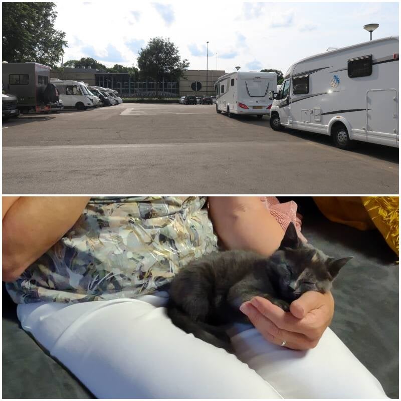 Vannacht heeft het dan toch echt geregend: meerdere buien maakten ons wakker. En vanmorgen gaat het gewoon door. We moeten vandaag nog de nodige kilometers maken en dus gaan we maar vast op weg. Straks maar zien of we nog een stukje kunnen wandelen. Om naar Sittard te kunnen rijden blijken we jammer genoeg alle tijd nodig te hebben. We vinden nog een plekje op de Nieuwe Hateboer en gaan lopen naar ons familiebezoek. Toch nog wat actiefs gedaan vandaag. Na een gezellige avond met o.a. een jong katje, komen we terug op de cp en zien dat er intussen 17 campers staan! Gelukkig hebben we onze plek voor vannacht.