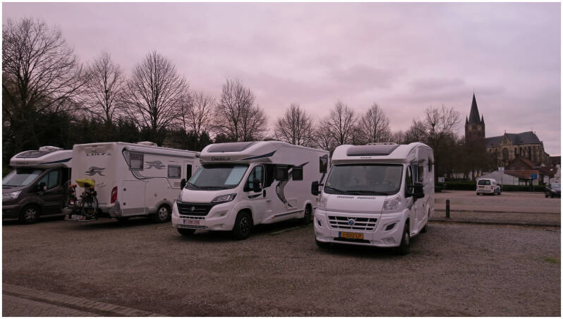 Helaas, de asperges zijn uitverkocht en bloemstukjes voldoen niet. Dat wordt nog een andere Appie opzoeken. In Brunssum slagen we gelukkig wel en even later bereiken we de Parking Nieuwe Hateboer. Er staan al veel campers en met de laatkomers erbij komen we op 13. Het camperseizoen is weer begonnen😀.